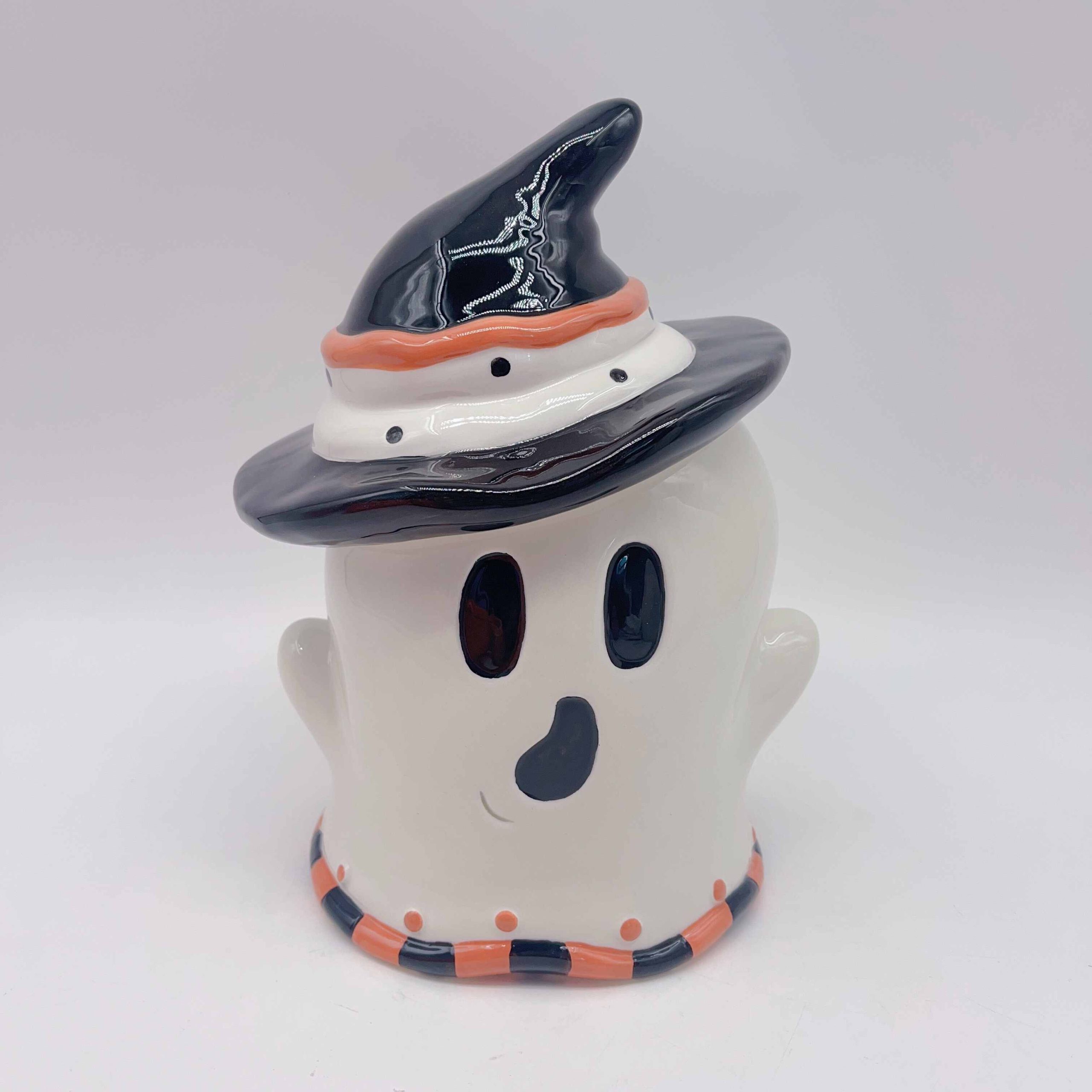 Elevate your Halloween decor with our Ceramic Halloween Ghost Jar. This charmingly spooky jar features a cute ghost design, crafted in smooth ceramic that gleams under candlelight. Perfect for storing treats or tiny trinkets, its whimsical aura and gentle curves add an enchanting touch to any space.