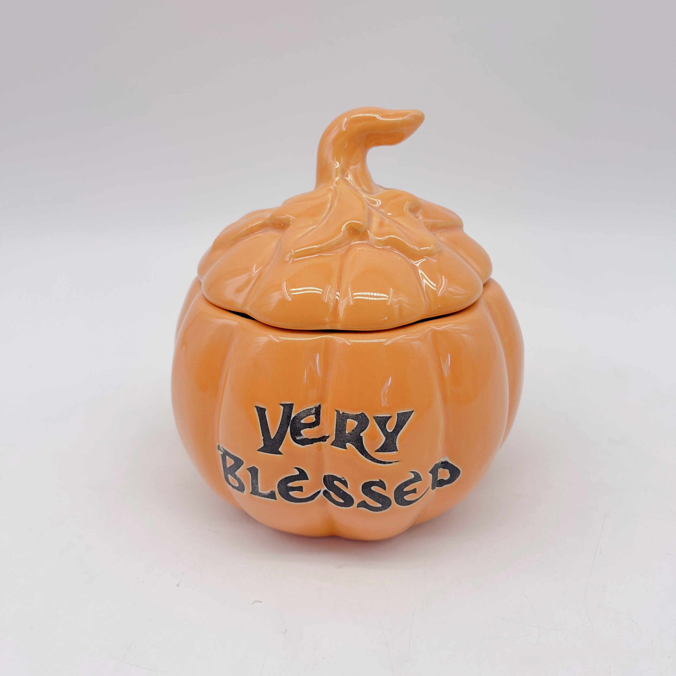 Embrace the Halloween spirit with our Ceramic Pumpkin Jar! Adorned in vivid orange, it boasts bold black letters that spell out spooky delight. Perfect for treats or decor, its smooth ceramic finish gleams under candlelight, inviting an enchanting ambiance to your festive celebrations.