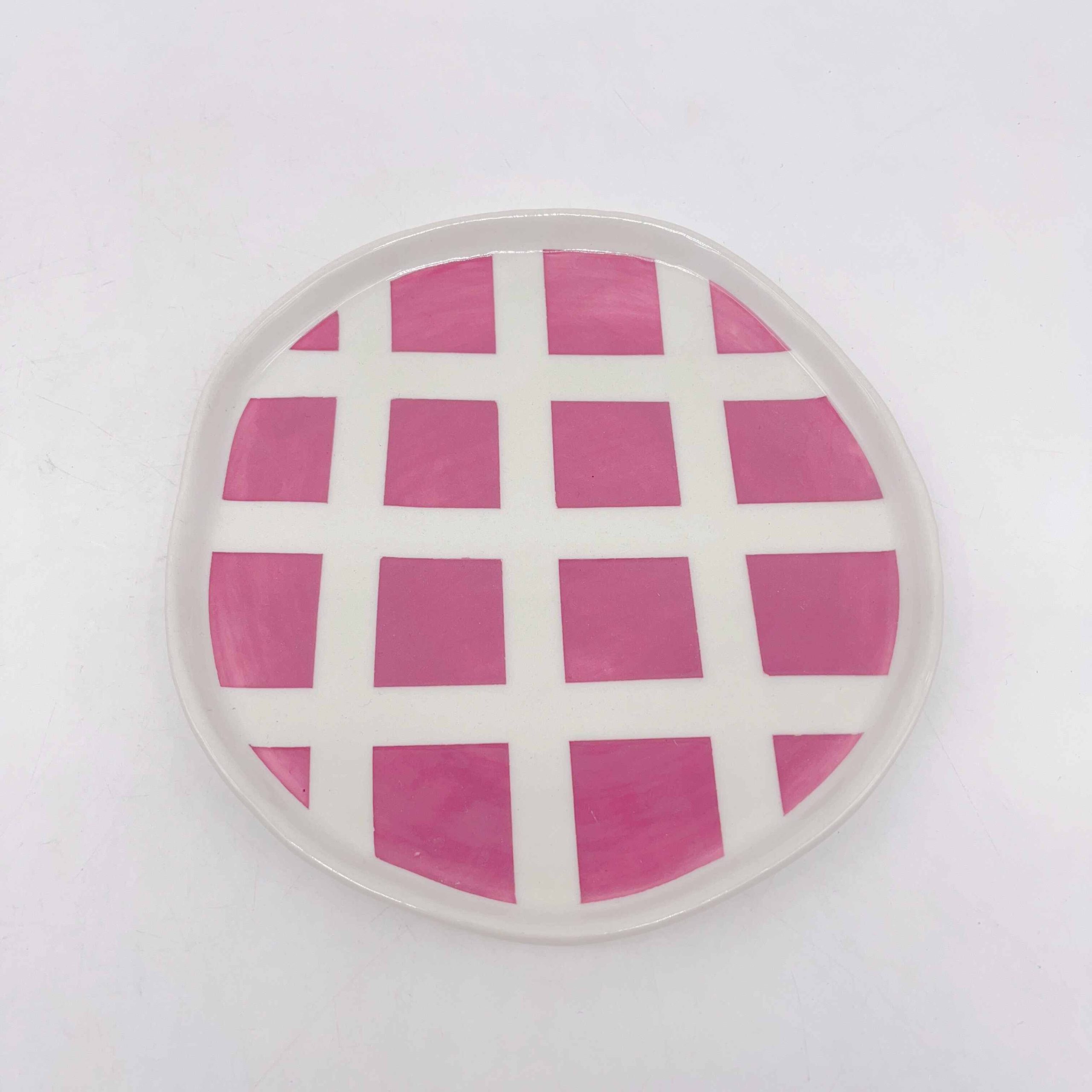 Elevate your dining experience with our Ceramic Irregular Plate in a Small Plaid Pattern, drenched in vibrant rose red. Its unique, wavy edges and intricate design create a visual feast, while the smooth ceramic surface invites touch. Perfect for showcasing culinary creations with flair and elegance.