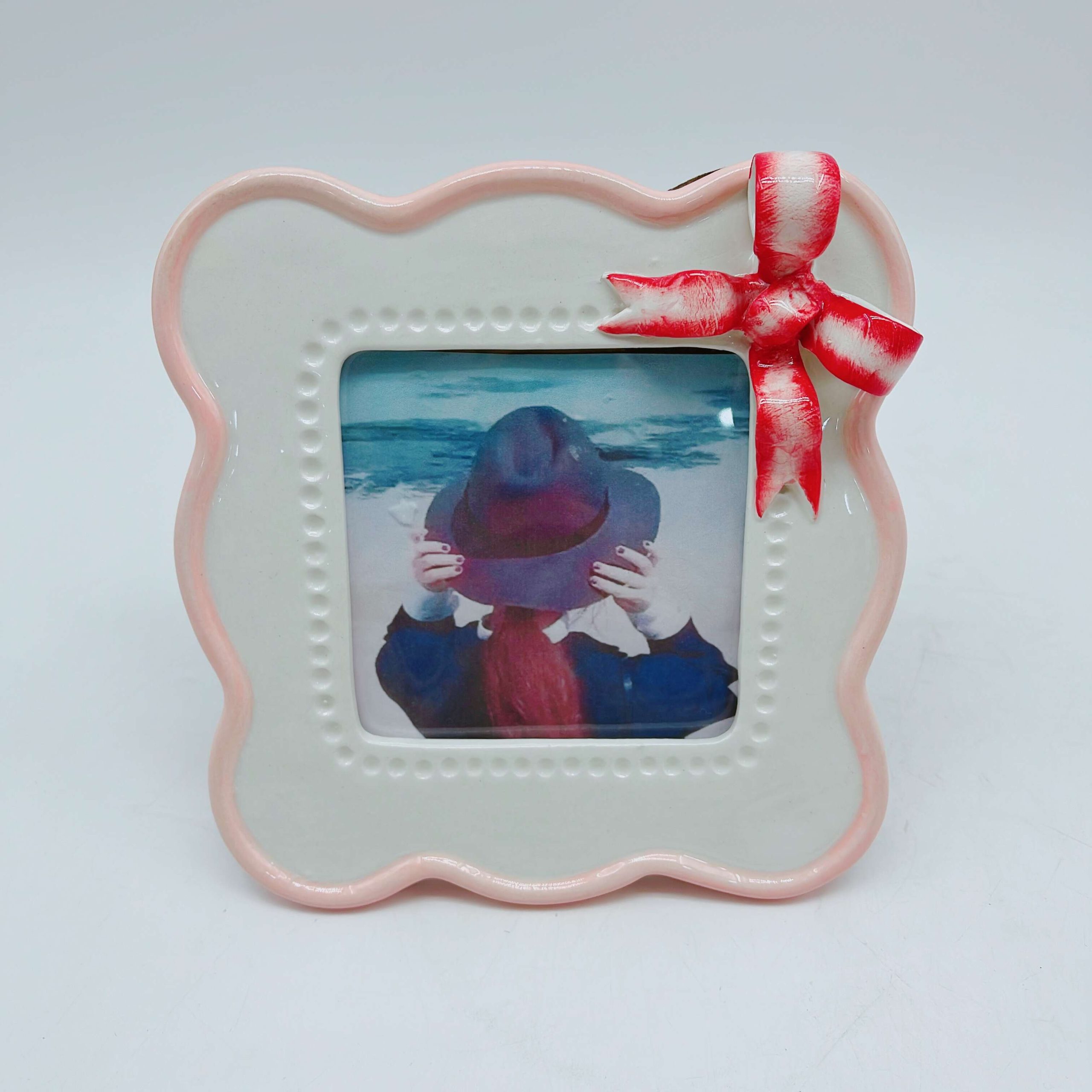 Adorn your cherished memories with our Ceramic Pink Bow Picture Frame. This elegant frame features a delicate, glossy pink finish and a charming bow accent that adds a touch of whimsy. Perfect for adding warmth and grace to any room, it beautifully cradles your photos in style.