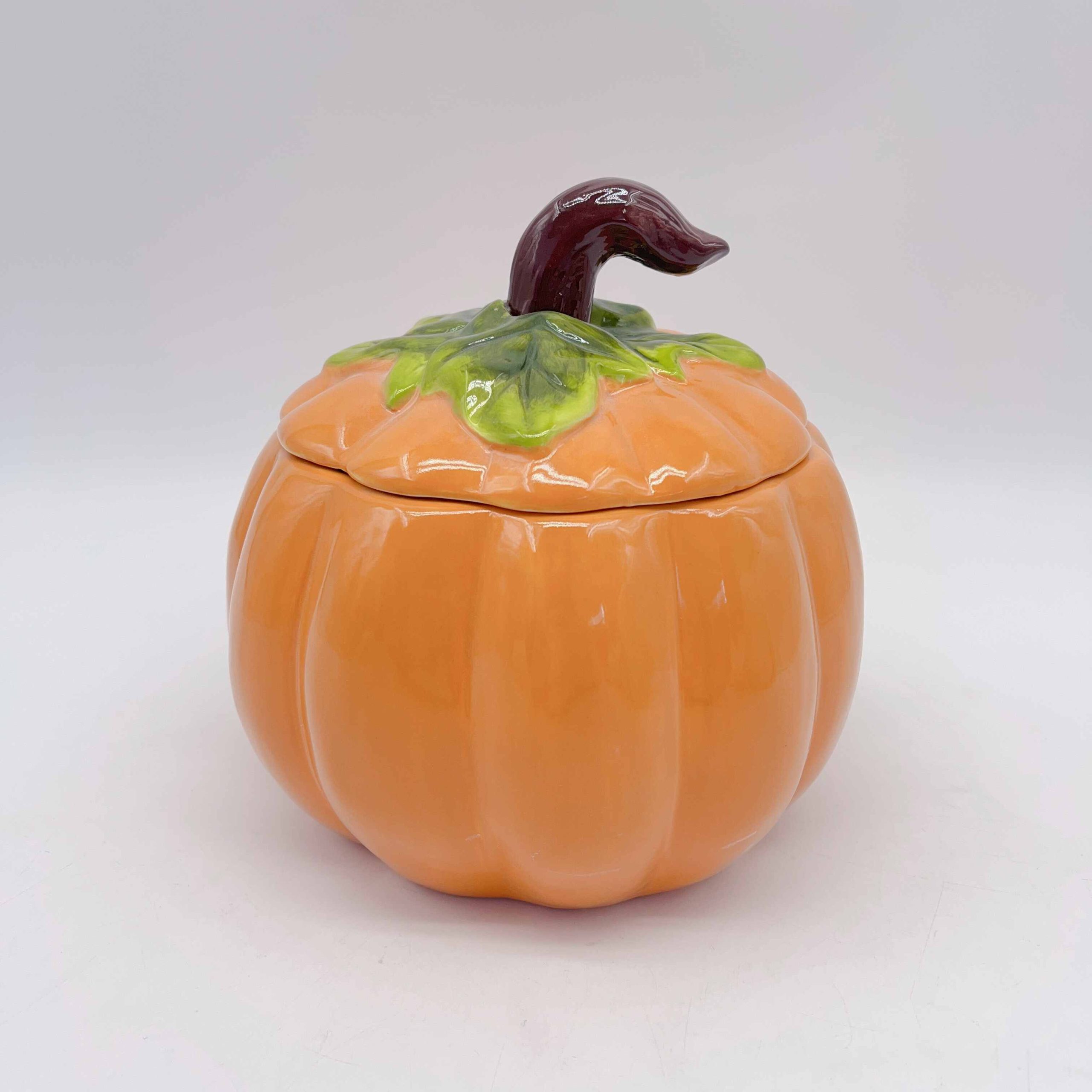 Embrace the spirit of fall with this Ceramic Pumpkin adorned with a vibrant green leaf. Its smooth, glazed surface glistens under soft candlelight, casting warm autumn hues across your space. Perfect for Halloween decor, it adds a touch of rustic charm and seasonal elegance to any setting.