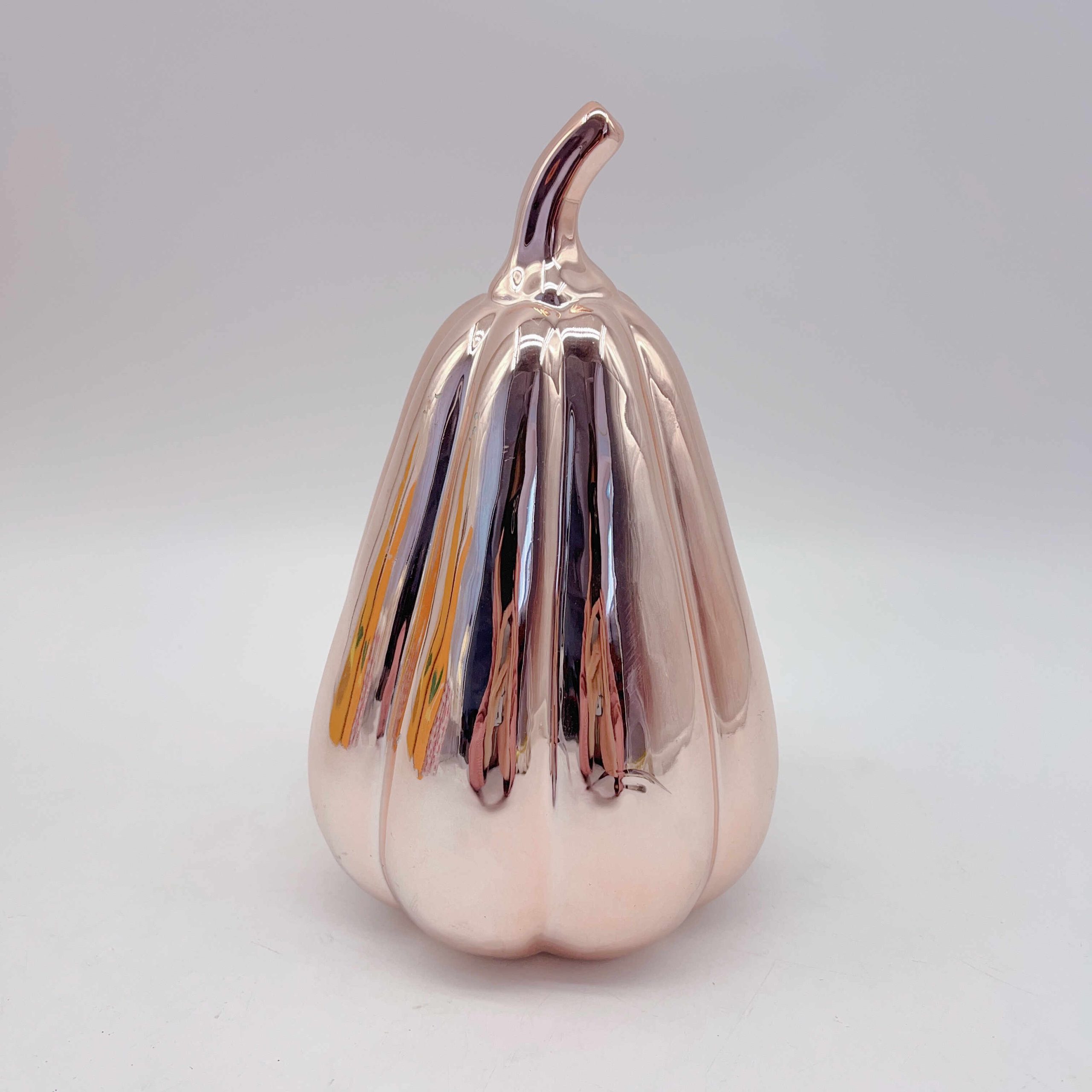 Elevate your autumn decor with our Small Ceramic Electroplated Gold Pumpkin. This gleaming treasure, bathed in a lustrous golden sheen, captures the essence of fall luxury. Its smooth ceramic curves and shimmering finish create an enchanting centerpiece that radiates warmth and elegance in any space.