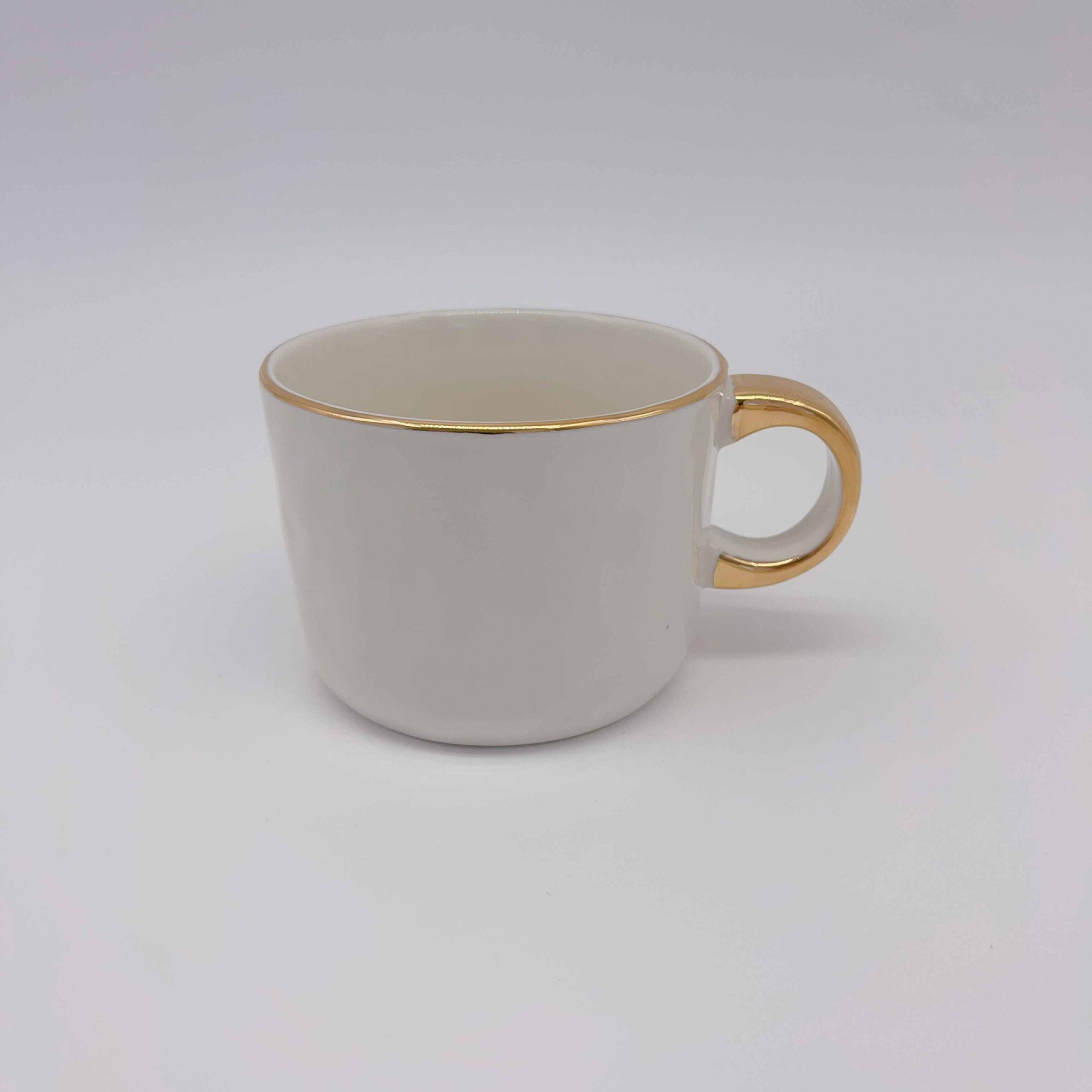 Elevate your sipping experience with our Small White Ceramic Faux Gold Cup. This exquisite piece boasts a smooth, glossy white finish that gleams under light, while the faux gold accents add a touch of opulence. Perfectly sized for espresso or tea, it feels luxurious in hand and adds elegance to any setting.